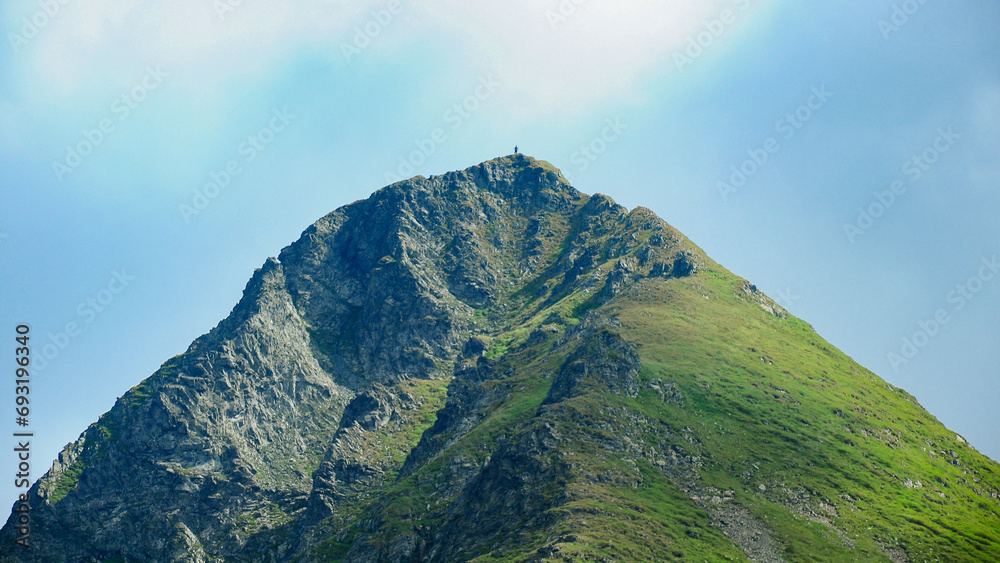 A silhouette of a hiker on top of a mountain summit. The peak is sharp and rocky with cliffs covered with grass. Hiking activity in Carpathian Mountains. Romania.