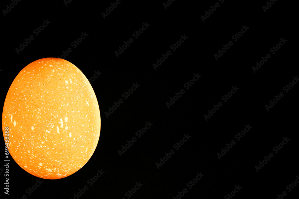 Pores in the shell of a chicken egg, illuminated from the inside, on black background. This is where pathogenic bacteria such as Salmonella enter. Space for text