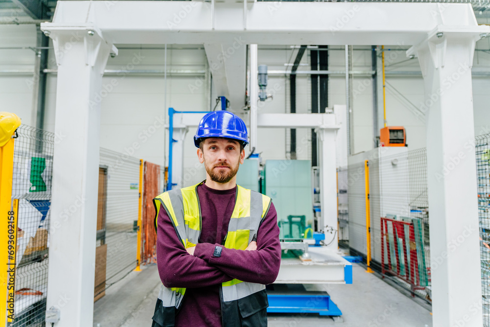 portrait of a man in a helmet and overalls at a glass cutting and tempering plant against the background of a cutting machine.