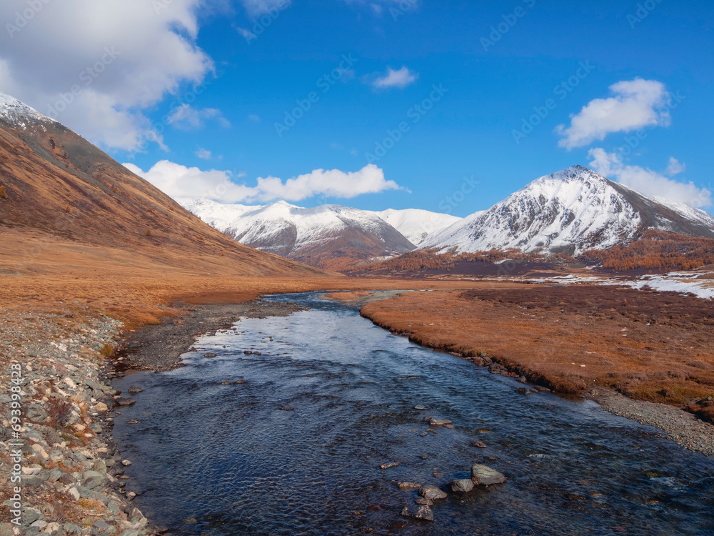 Colorful river in the fall. Golden leaves on larch trees along turquoise stormy mountain river in sunshine. Bright scenery with mountain river and yellow trees in autumn colors in fall time.