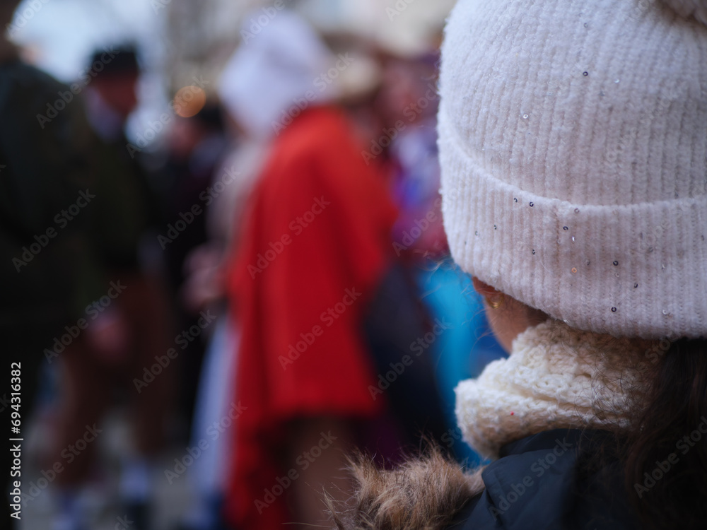 Enfant avec bonnet qui regarde un spectacle de rue en arrière-plan.