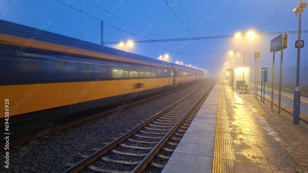 Passage of a passenger train to the station in fog. Night train passing through the station. Concept of passenger rail transport. Night passenger train in fog