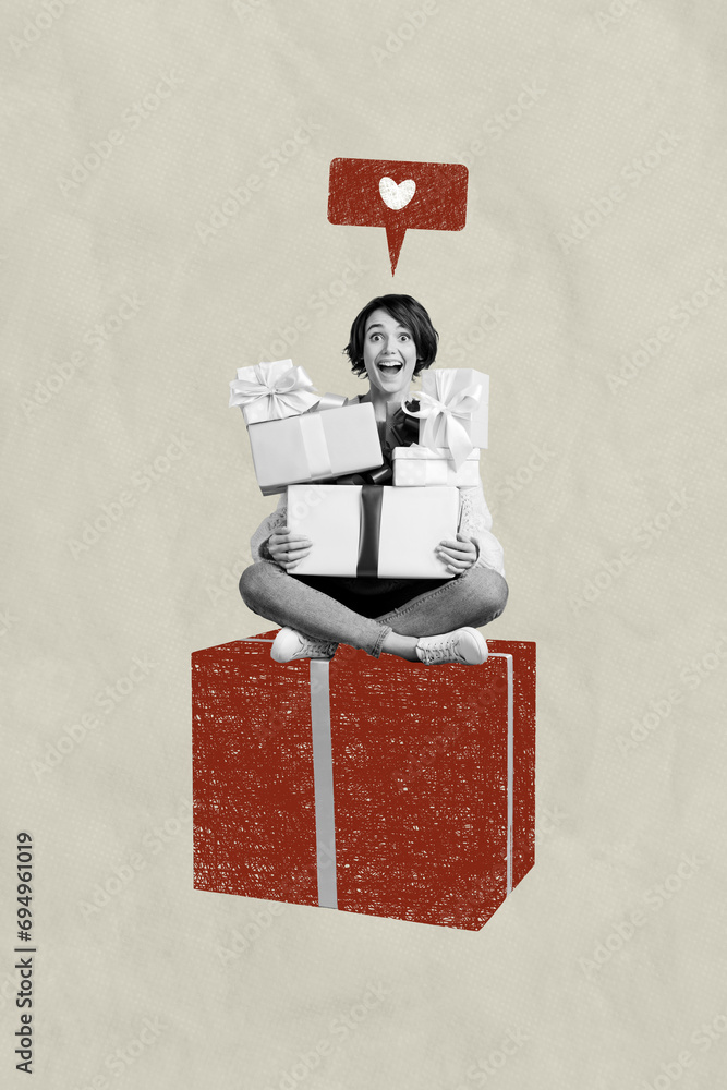 Vertical collage picture of astonished black white colors girl sit huge painted giftbox like notification isolated on paper background