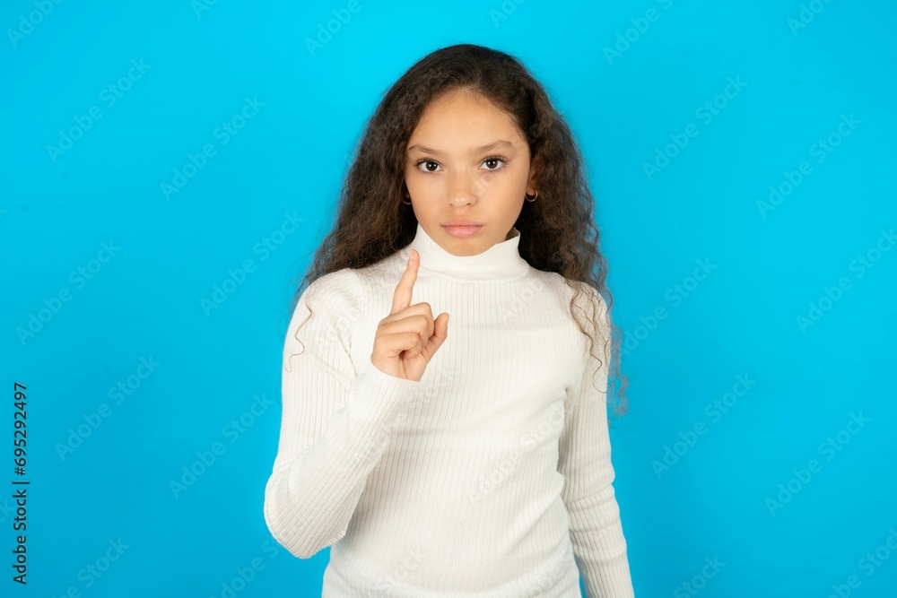 Young beautiful teen girl wearing white turtleneck over blue background frustrated and pointing to the front
