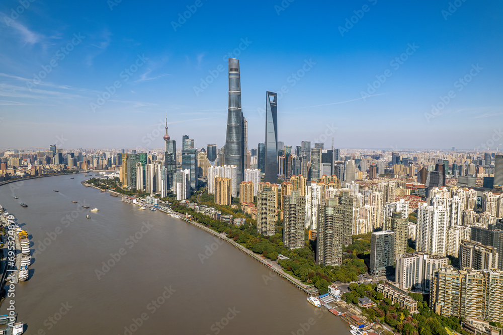 Aerial view of Shanghai skyline and modern buildings with the Huangpu River, China. Panoramic view.