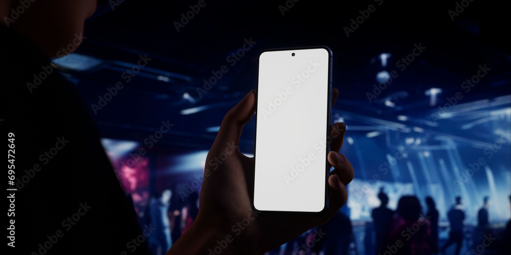 Caucasian woman holding phone, night club in the background, blank screen mockup