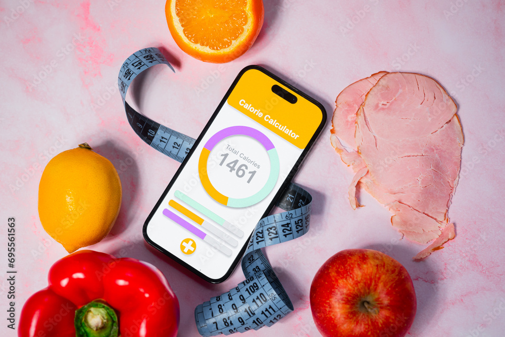 An application for counting calories next to healthy eating. Calorie deficit and weight loss. Maintaining a healthy and balanced diet