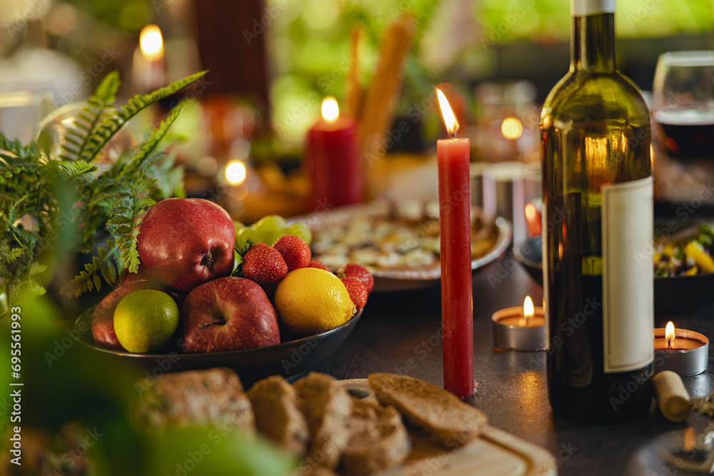 Cozy holiday table with different delicious food, beverages and candles ready for friends home party