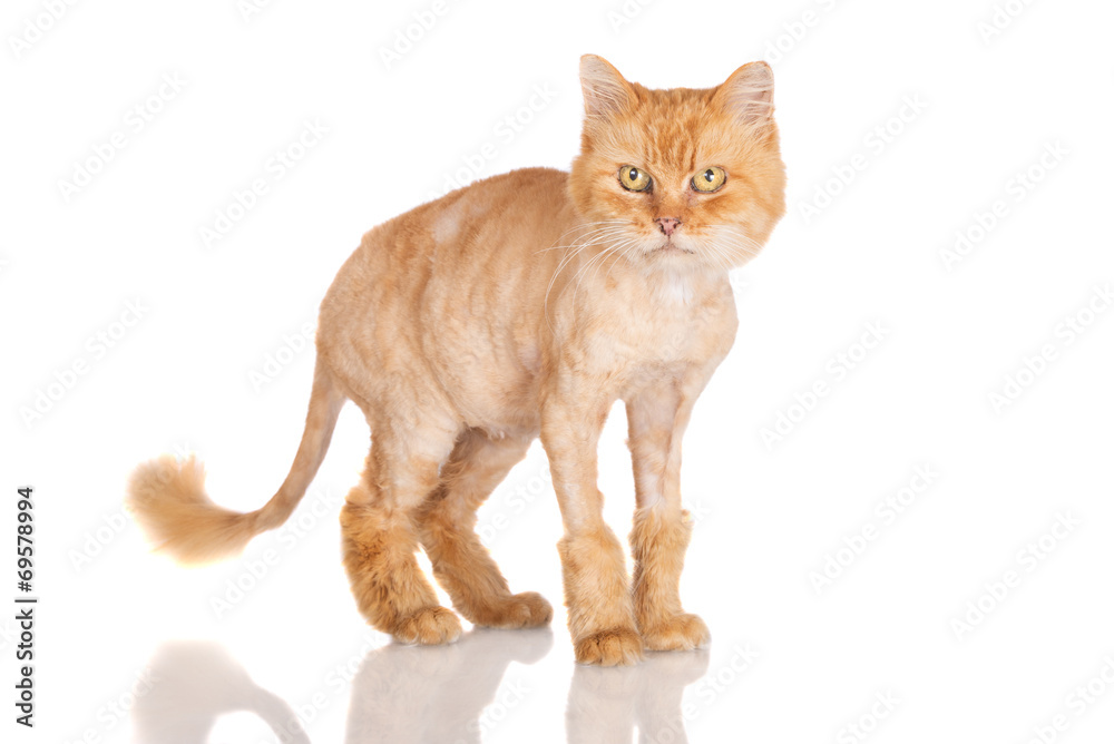 red shaved cat on white