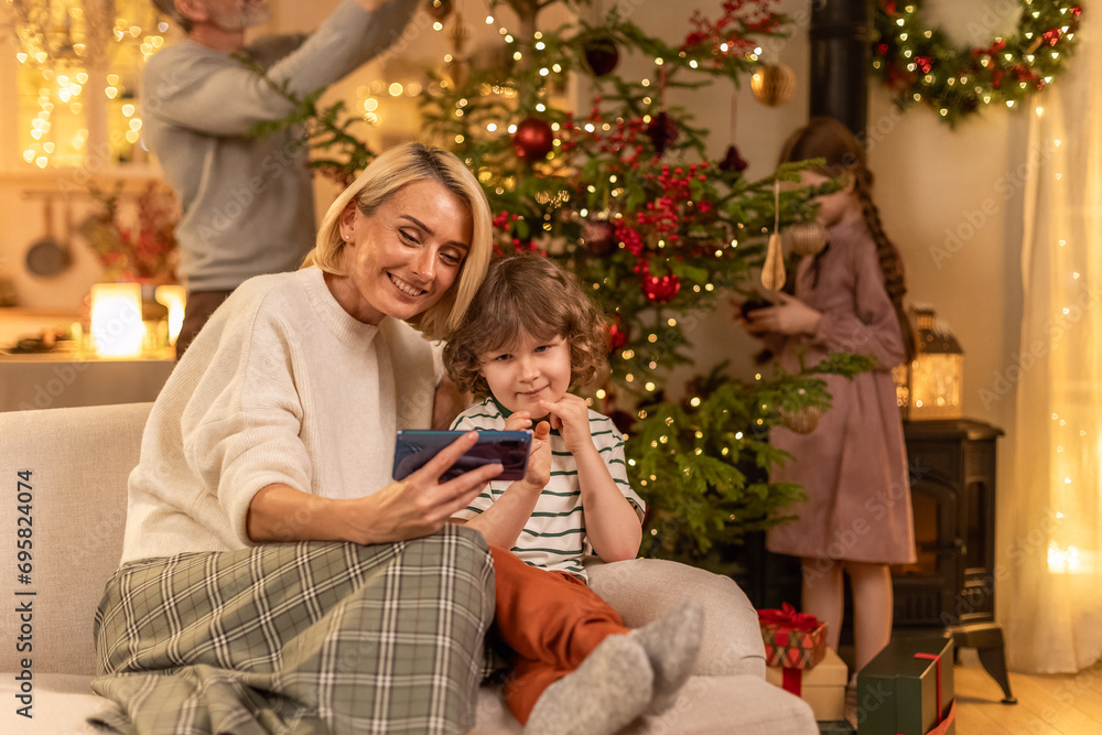 mom and son make video call to far distance relatives on holidays to wish merry Christmas, sitting on couch near Christmas tree. take selfie, smiling