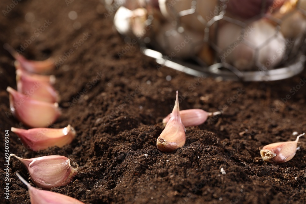 Garlic cloves in fertile soil, closeup. Vegetable planting