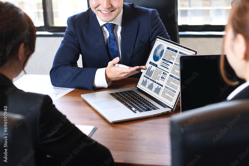 ノートパソコンで顧客に説明をするアジア人のビジネスマン