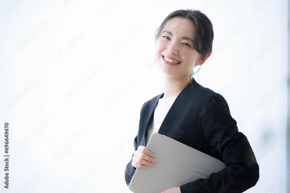 メインビジュアルにも!ノートパソコンを持ったビジネスウーマンのカメラ目線のクローズアップ 秘書や就活などのイメージ