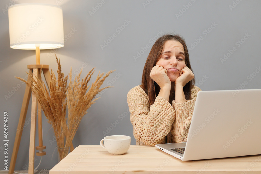 Browsing manager business. Sad bored brown haired woman wearing beige sweater looking on computer display with boring displeased expression while sitting at table in home office