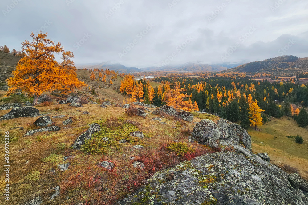 Samakha steppe in autumn. Beautiful autumn mountain steppe landscape. Beautiful autumn view, mountain scenery. Altai region.