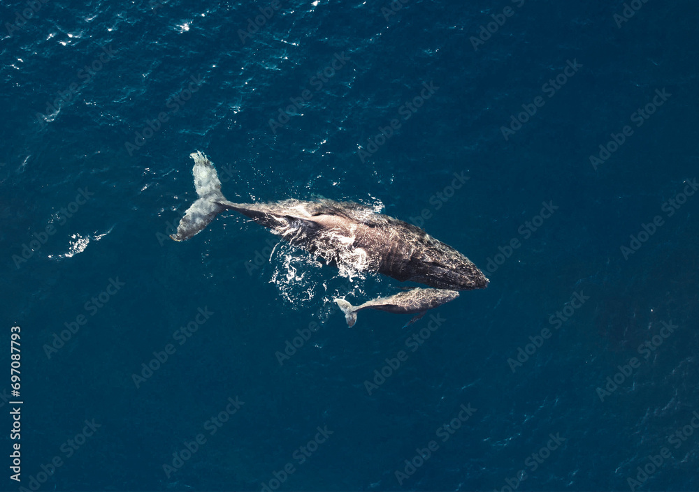 Aerial picture of a mum and a calf humpback whales breathing at the surface in the Ningaloo reef, Western Australia. Two beautiful whales in Exmouth.