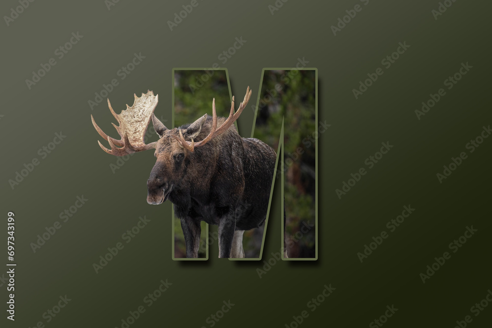 The letter M is embedded with a picture of the animal Moose. Great animal background.