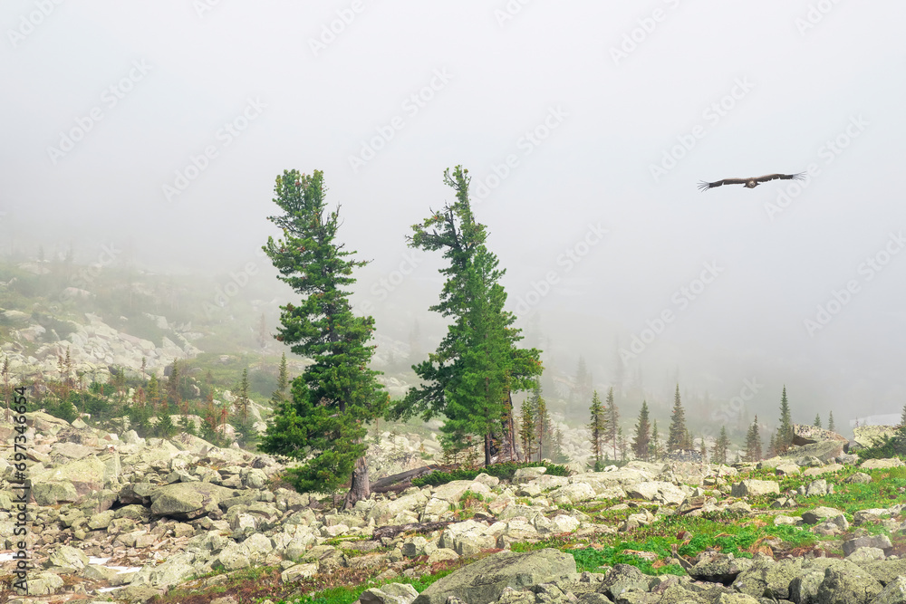 Century-old cedars on a sunny rocky glade in a misty haze. Impressive Siberian nature of the Western Sayans.