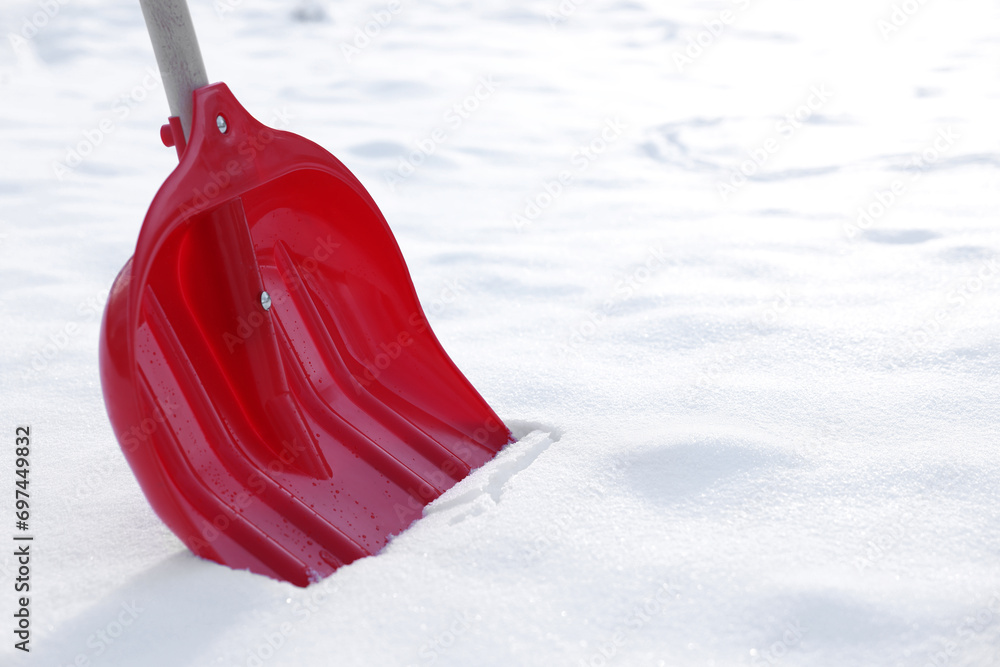 Snow shovel with wooden handle outdoors, closeup. Space for text
