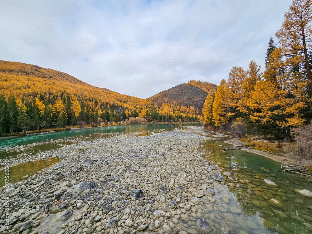 Low water season. Wide shallow river in late autumn, the Argut mountain river in Altai.