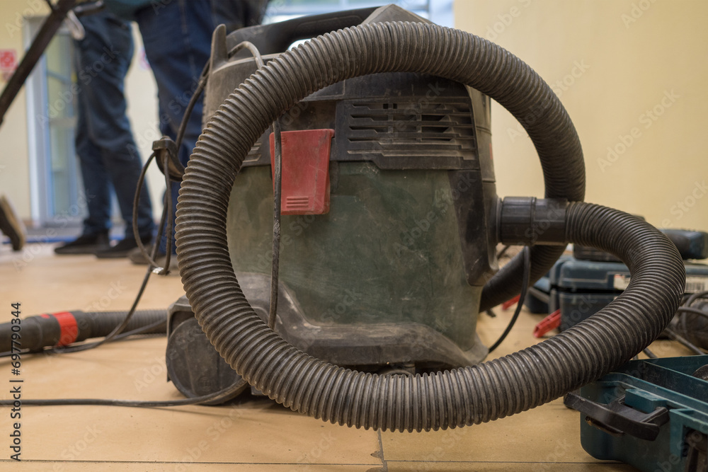 An industrial vacuum cleaner on a dusty floor in a building under construction and renovation.