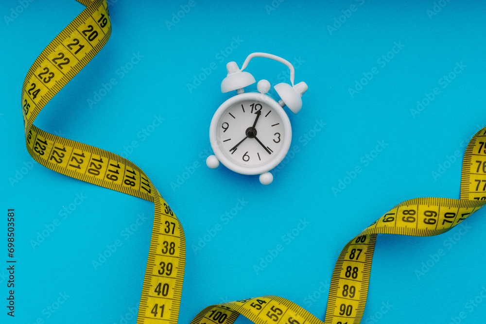 Measuring tape and alarm clock on blue background close-up. Diet concept