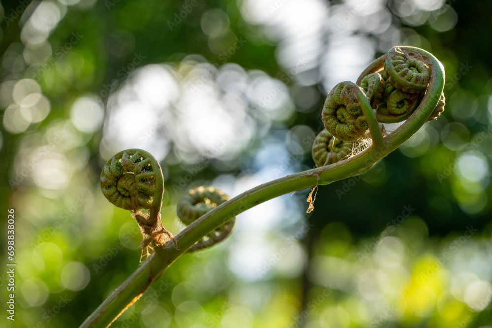A green tropical pohole fern, Diplazium esculentum, grows with curled fronds.