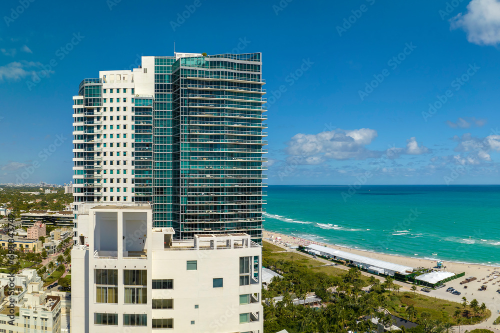 Popular vacation spot in the United States. Ocean warm waters and sandy beachfront at Miami Beach in Florida, USA. American travel destination