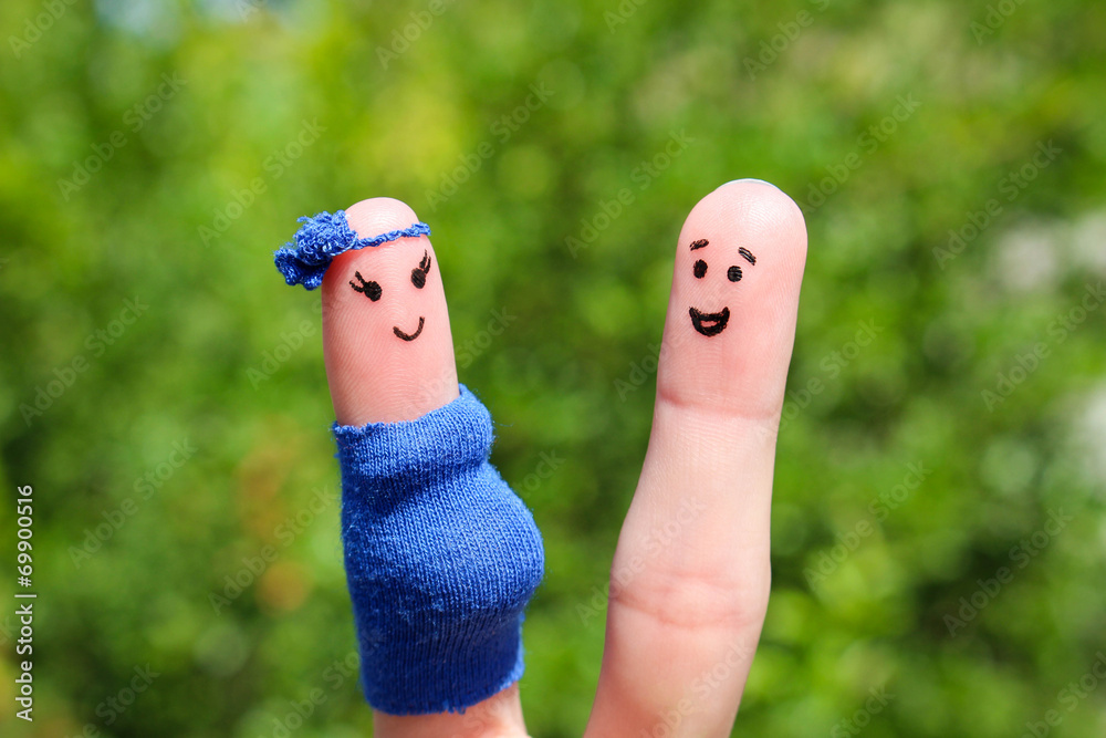 Face painted on fingers. Happy couple, the woman is pregnant.
