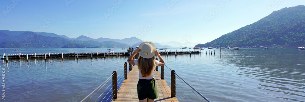 Holidays in Brazil. Panoramic banner view of young traveler woman walking on pier enjoying landscape in Ubatuba, Brazil.