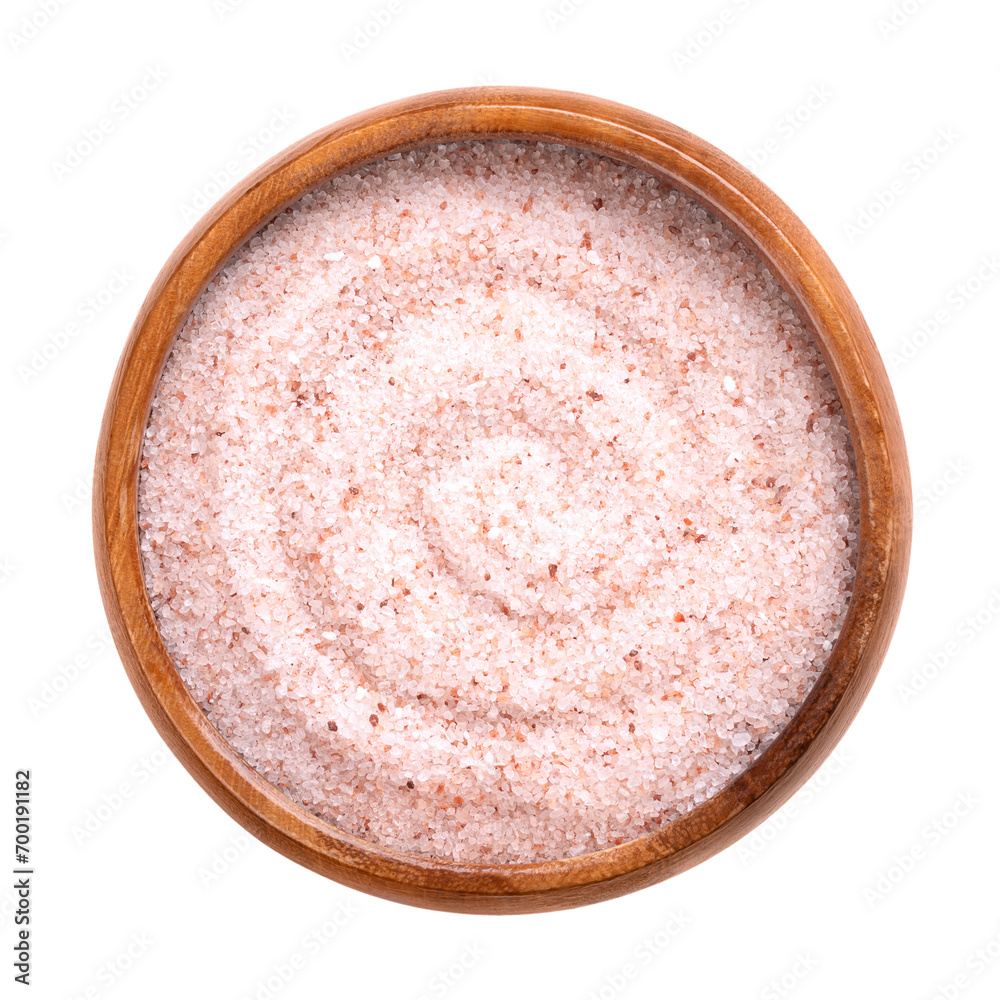Himalaya pink salt fine, in a wooden bowl. Fine Himalayan salt, rock salt and halite with a pinkish tint, due to trace minerals, mined from Punjab region, used as food additive to replace table salt.
