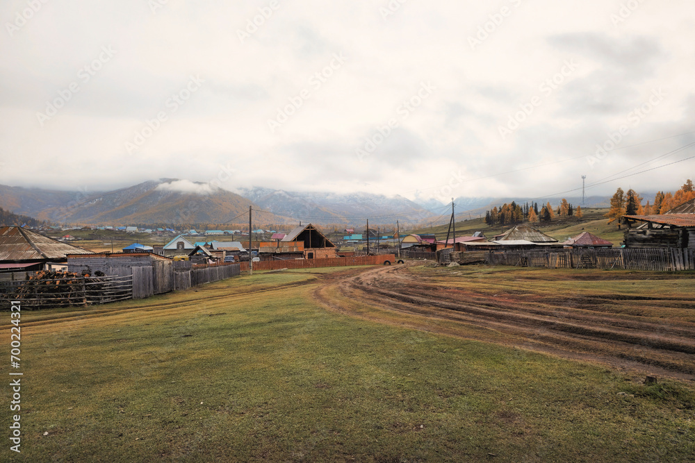 Autumn dirt road from a hill to a remote village. Off-road, dirt road up the slope in a remote woodland with yellow autumn larches.