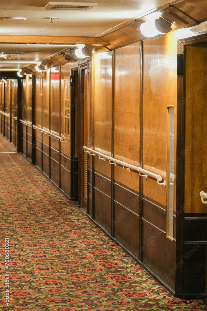 Wooden paneled cabin corridor hallway aisle to staterooms and suites onboard legendary ocean liner cruiseship cruise ship
