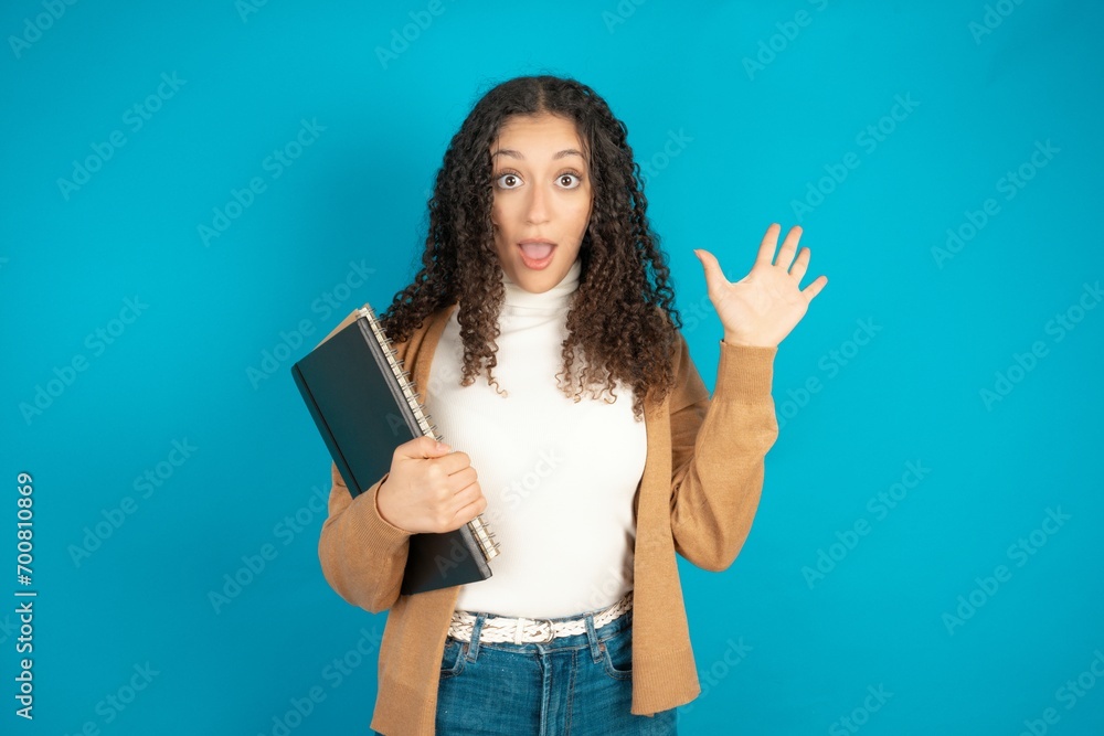 Delighted positive beautiful teen woman wearing beige knitted jacket opens mouth and arms palms up after having great result