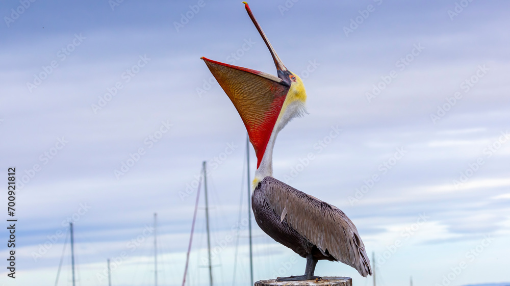 A Brown Pelican posing on a pier
