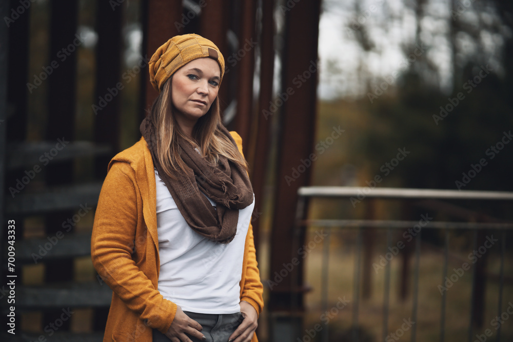 Woman brunette in knitted wool with hat and brown scarf, standing in front of a steel frame in the autumn forest.