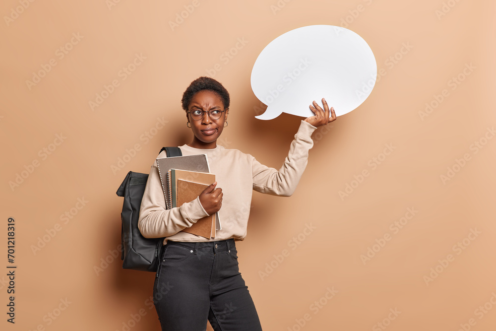 Studio shot of African schoolgirl dressed casually holds spiral notepads and blank speech bubble for your promotion carries rucksack ready for new studying year poses against brown background