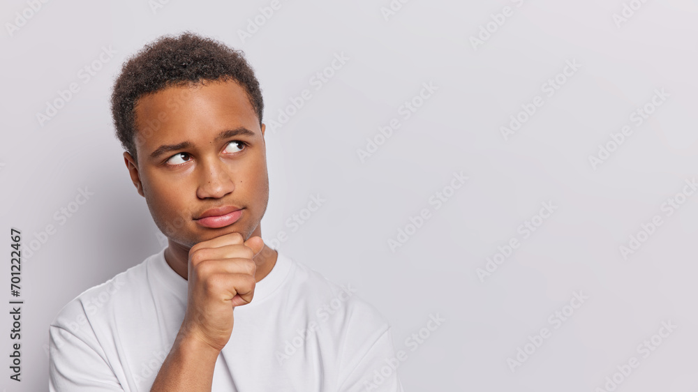 People emotions concept. Indoor photo of young fit thoughtful African american man standing on left isolated on white background looking at blank space for you advertisement wearing t shirt
