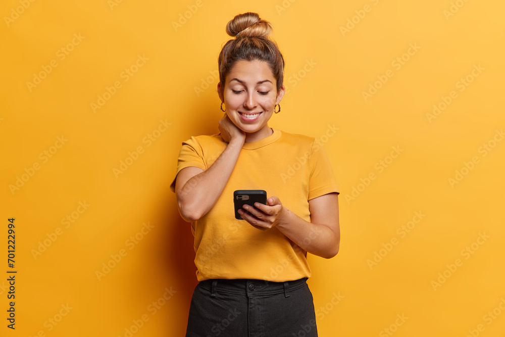 Waist up shot of pleased European woman smiles gently keeps hand on neck focused in smartphone screen enjoys online communication wears casual t shirt and black trousers isolated on yellow background