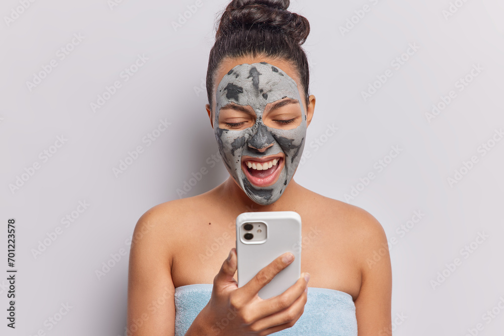 Indoor shot of emotional Latin woman with facial clay mask on face exclaims loudly holds mobile phone surfs beauty sites and reads information wrapped in towel isolated over white background