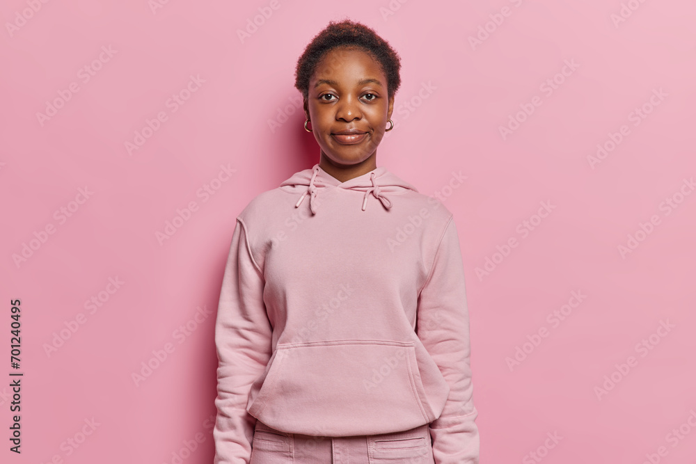 People positive emotions concept. Studio waist up of young happy smiling gently African american lady standing isolated in centre on pink background wearing costume keeping hands down looking straight