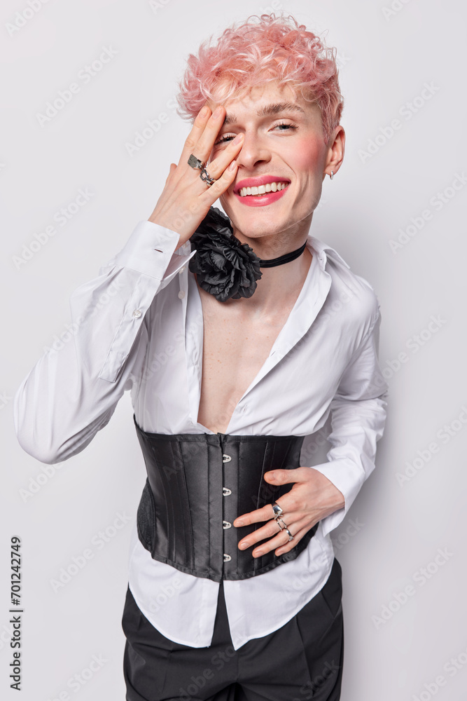 Vertical indoor shot of young happy smiling European lgby male with pink short hair standing in centre isolated on white background wearing shirt corset trousers and black flower as necklace