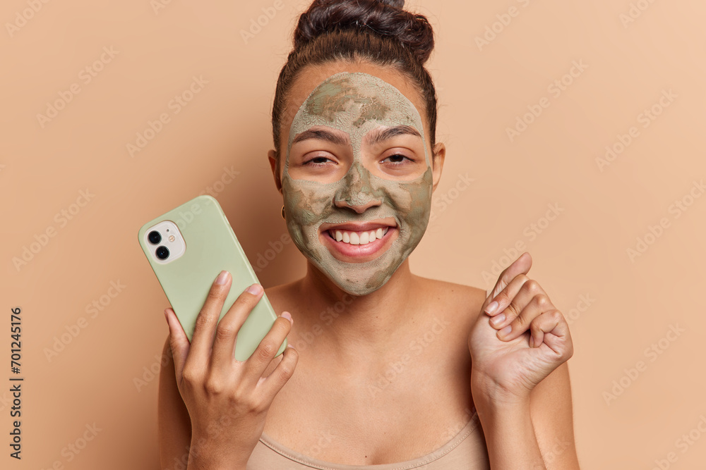 Self care and beauty concept. Positive Latin woman makes beauty treatments after bath has face covered with clay moisturising mask uses mobile phone clenches fist isolated over brown background