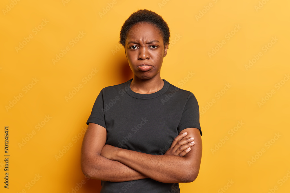 People negative emotions concept. Studio shot of young upset dissatisfied African american female standing in centre isolated on yellow background wearing black t shirt keeping raised hands crossed