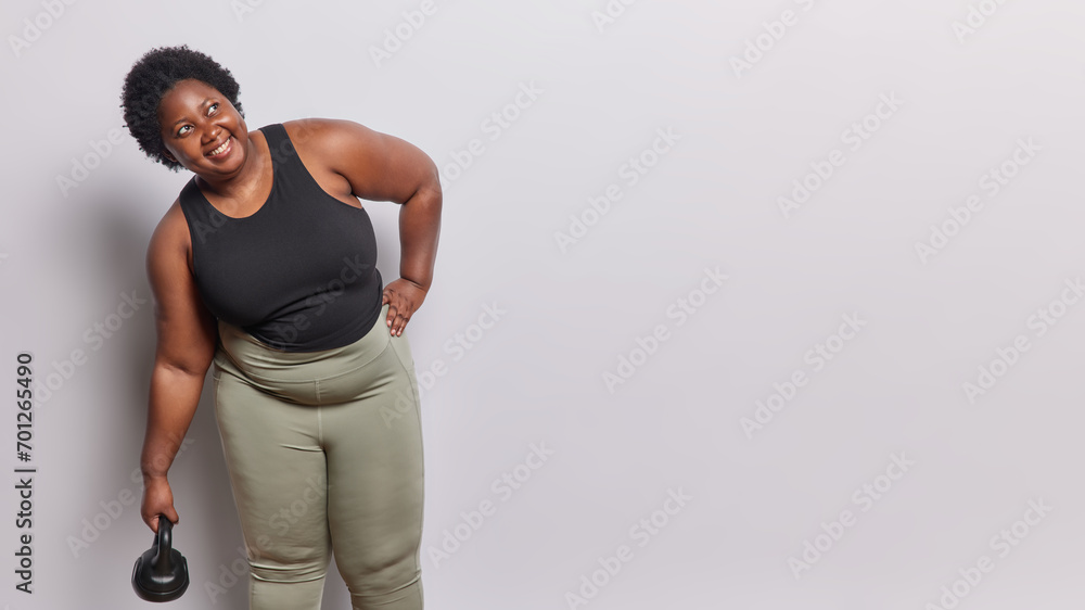 Indoor shot of plump dark skinned woman dressed in sportswear lifts weight smiles happily looks aside with glad expression isolated over white background copy space for your advertisement or promotion