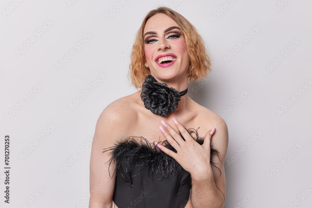 Gender fluid man with vivid makeup and manicure wears black corset and chain around neck smiles broadly being positive comes on party for gays isolated on white background. Non traditional orientation