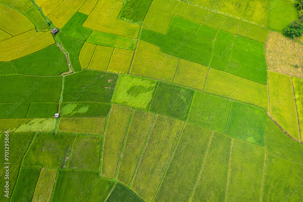 Aerial view natural of the green and yellow rice field, of agriculture in rice fields for cultivation in Nan Province, Thailand.