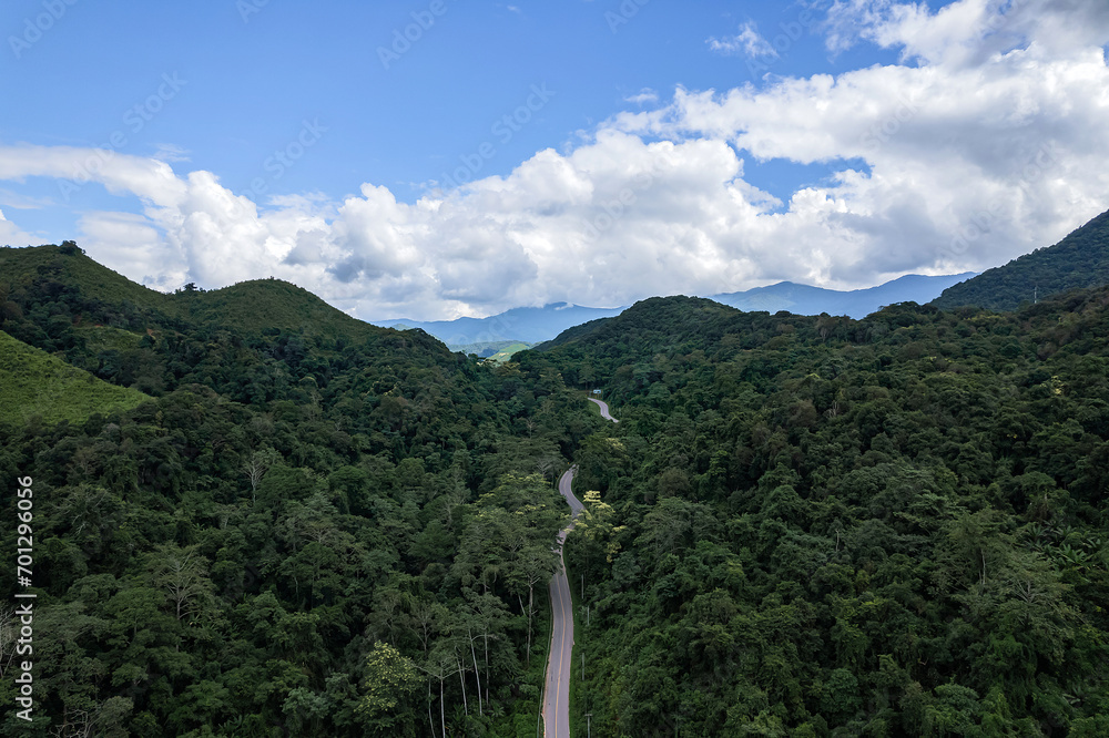 Aerial view of a road in the middle of the green forest and road curve construction up to mountain.