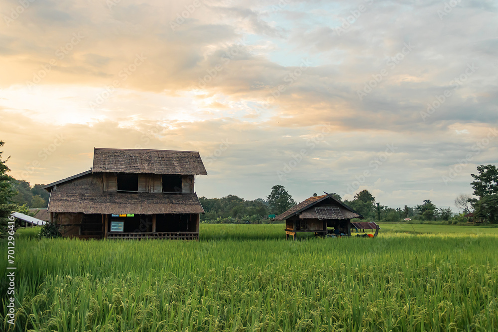 Beautiful green paddy field with an old wooden house with during sunset.