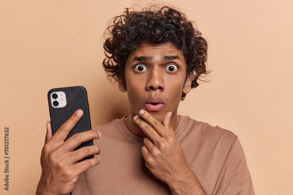 Photo of stupefied Hindu man with dark curly hair keeps hand on chin has astonished facial expression uses mobile phone reads surprising news isolated over brown background. Technology user.